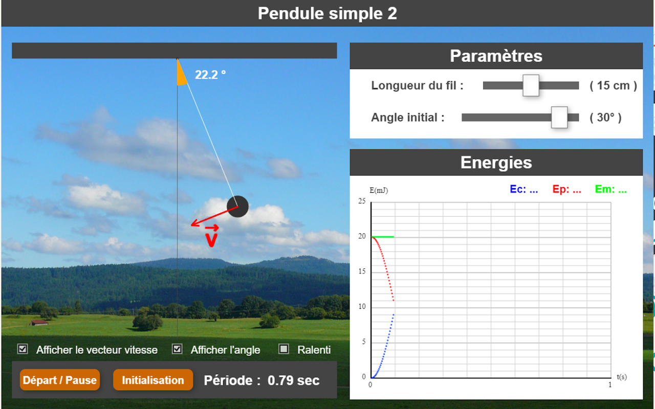 L’application Pendule simple 2 permet de voir comment évolue l’énergie cinétique, potentiel et mécanique au cours du temps d'un pendule simple. Il est possible de modifier l’angle de lancement initial et la longueur du fil.