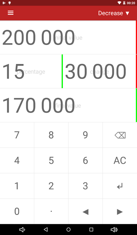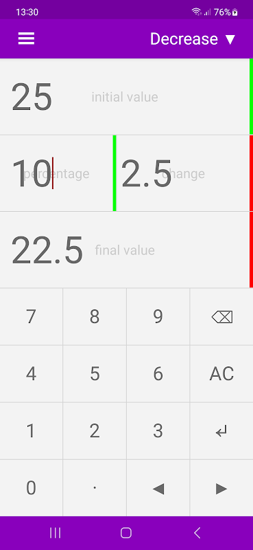 • استعمال میں آسان انٹرفیس فیصد تبدیلیوں کے حساب کتاب کی اجازت دیتا ہے۔