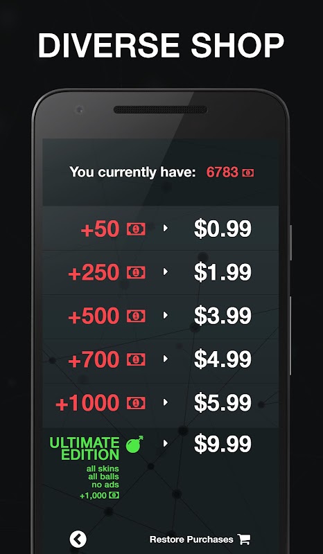 Use in-game money for continues when needed or accumulate specific quantity to unlock game skins and ball shapes.