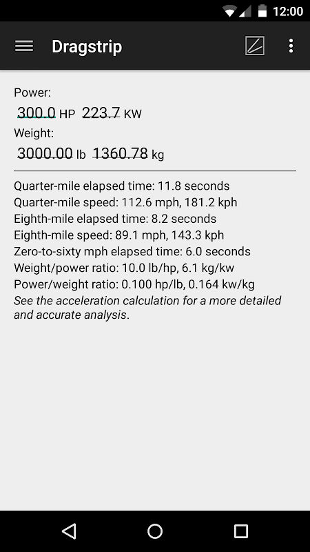 - ڈریگ اسٹریپ (طاقت اور وزن پر مبنی مختلف رفتار اور فاصلوں کے لئے سادہ ایکسلریشن حساب)