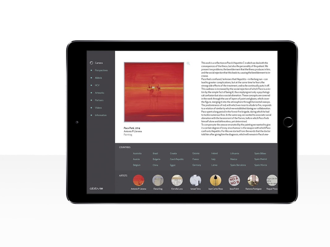 Perspectives HCV is a mobile application designed to complete the artworks of the project 'Perspectives - Art, liver diseases and me'. The app delves into the relationship between art and diseases and brings the project the added value of technology as a medium for artistic expression. Thus, the applications offer a new outlook on some works of art, in other cases they reveal the process of creation through interviews, audio pieces and 2D and 3D animations which complete the project with a different rewarding reading.