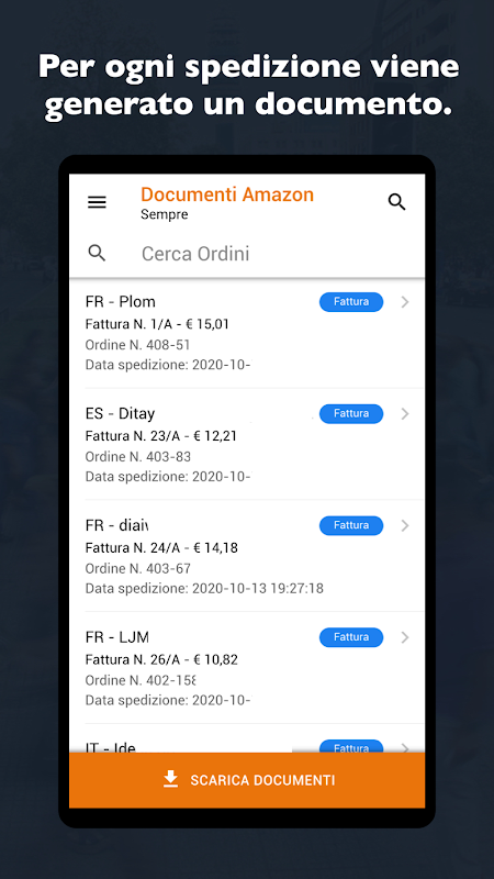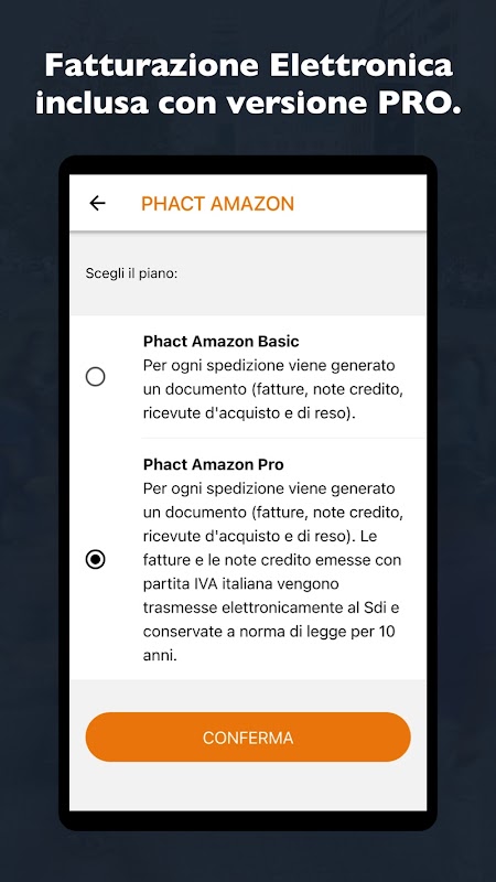 Phact Amazon کے PRO ورژن کے ساتھ، آپ کے الیکٹرانک انوائسز اور اطالوی VAT نمبر کے ساتھ جاری کردہ کریڈٹ نوٹس خود بخود ریونیو ایجنسی کو بھیجے جائیں گے اور 10 سال تک قانون کے مطابق رکھے جائیں گے۔