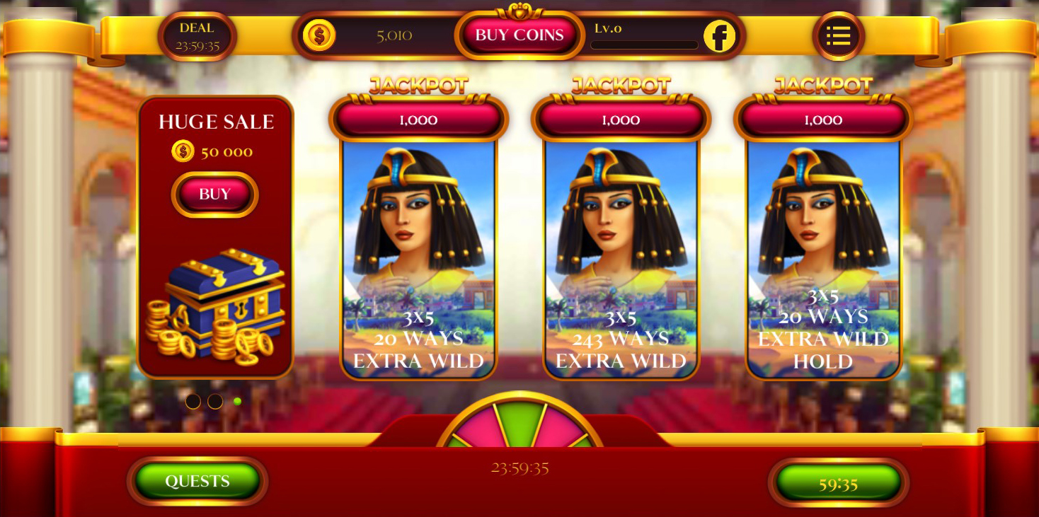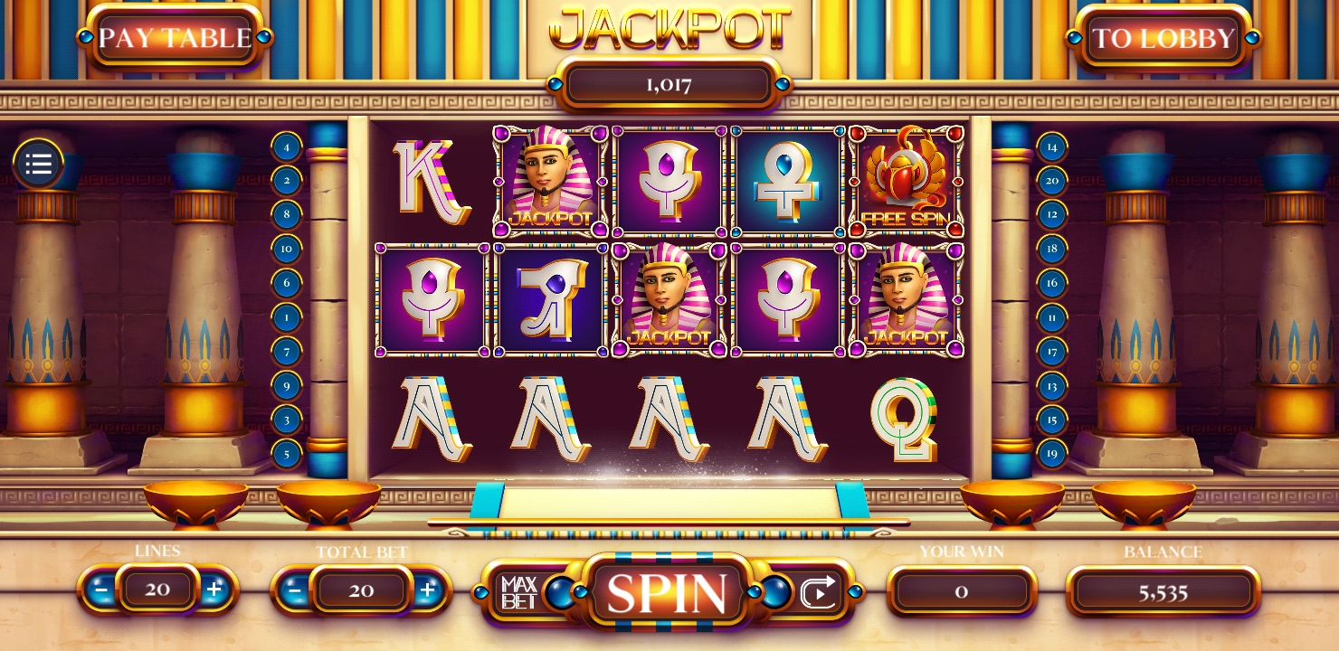 Paytable, lobby, and 3 different slots of Egyptian pharaoh style, full animations