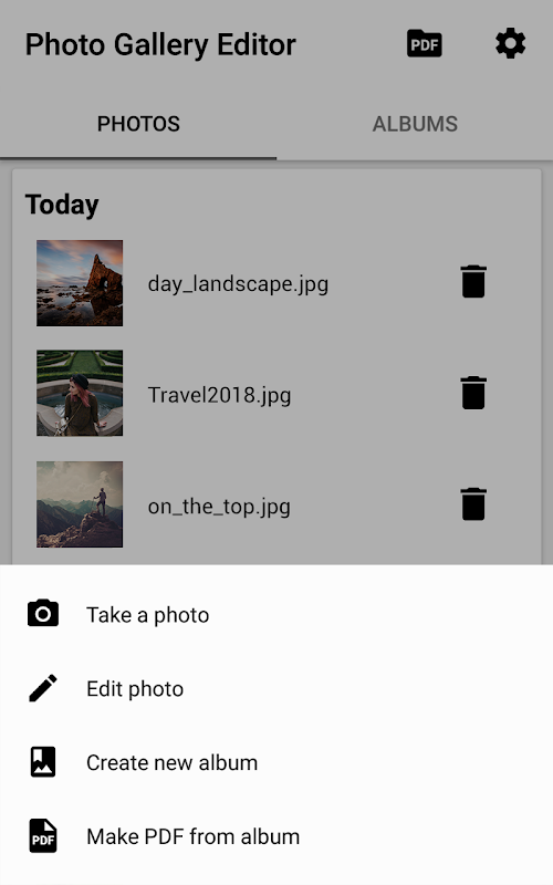 - Collage and Photo Album: You can make a photo album from the photos of the gallery and the images edited with the photo editor. Select your favorite photos and images, edit existing photos or make new photos with the camera to create the perfect album. Exporting albums to pdf, that is, creating PDFs of photos, images and photo albums is possible thanks to the PDF creator that allows to create PDFs from collages of photos and albums.