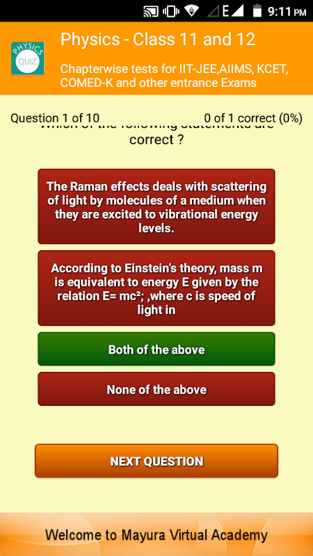 This app is an educational resource designed to try and help the students studying for their various UG Engineering and Medical entrance exams such as IITJEE, AIIMS, KCET, COMED-K to name a few. The app covers chapterwise tests for class 11 and 12 Physics subject. Each test will have 10 questions, while answering the question in test, student will be given with answer for that particular question, at the end of the test students can check their test score.