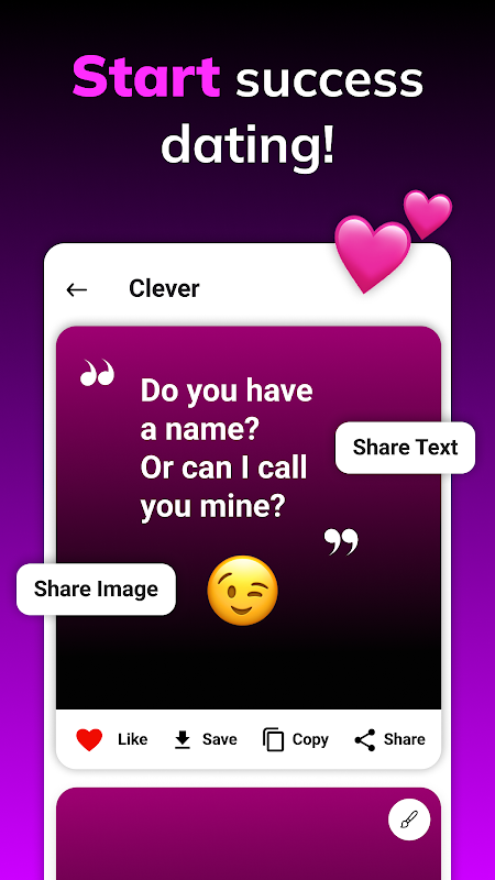 ہماری ایپ صرف آپ کو مواد فراہم کرنے کے بارے میں نہیں ہے۔ یہ تجربات پیدا کرنے کے بارے میں ہے۔ آسان نیویگیشن اور اپنی پسندیدہ پک اپ لائنوں کو نشان زد کرنے یا محبت کے متنی پیغامات کو براہ راست شیئر کرنے کی صلاحیت جیسی خصوصیات کے ساتھ، آپ ہمیشہ کسی کا دن بنانے سے صرف چند ٹیپس دور ہوتے ہیں۔