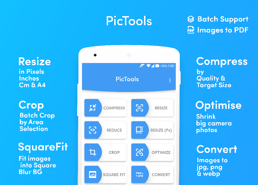 PicTools is an app and batch photo editing tool that helps you crop/resize/shrink/compress/rotate your phones in bulk!
