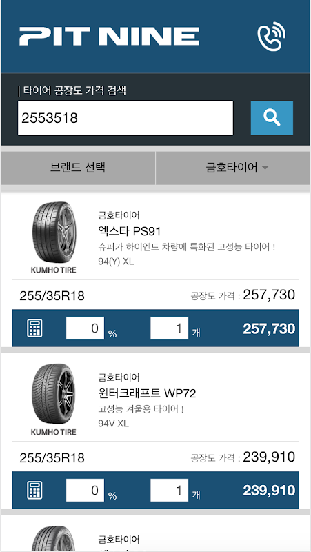 조회 결과 목록에서 타이어 공장도가 대비 할인율(%단위) 및 수량을 입력하여 간단한 계산이 가능합니다.