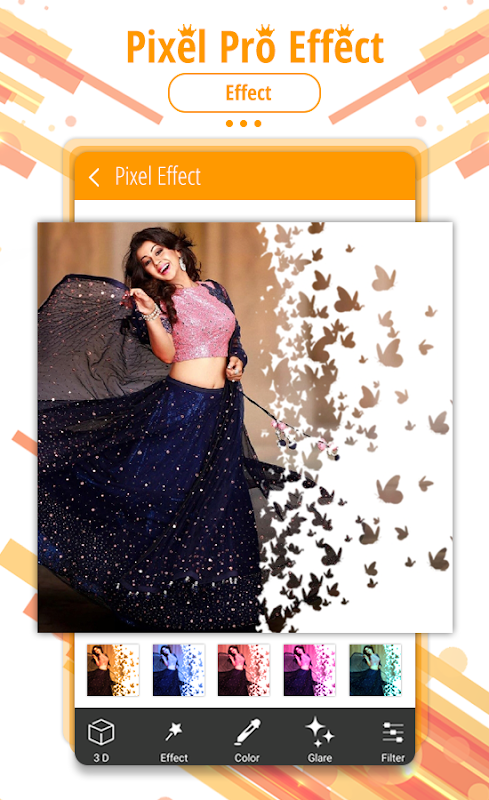 پکسل پرو اثر میں بہت سارے 3D پکسل اثرات ، 2D پکسل اثرات ، چکاچوند اثر ، فلٹرز ، اموجس اور اس کے علاوہ آپ درخواست پر متن لاگو کرسکتے ہیں۔ یہ سب آپ کو کامل اثر کے ساتھ آپ کی تصویر کو حیرت انگیز بنانے میں مدد فراہم کریں گے اور آپ براہ راست اشتراک کے ساتھ معاشرتی میڈیسیا کو دکھا سکتے ہیں۔