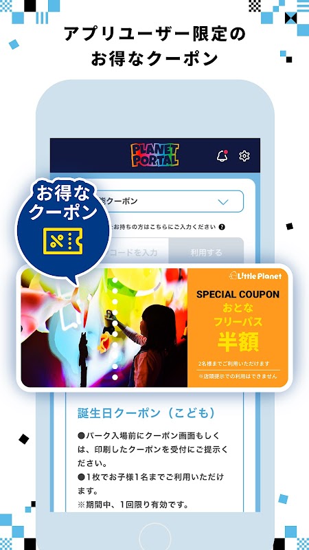 آپ اپنے حاصل کردہ کوپن استعمال اور ان کا نظم کر سکتے ہیں۔ ایپ کے لیے خصوصی کوپن بھی ہیں، لہذا آپ Little Planet کو بڑی قیمت پر استعمال کر سکتے ہیں۔ آپ اپنی سالگرہ کا اندراج کر کے سالگرہ کے کوپن استعمال کر سکتے ہیں۔