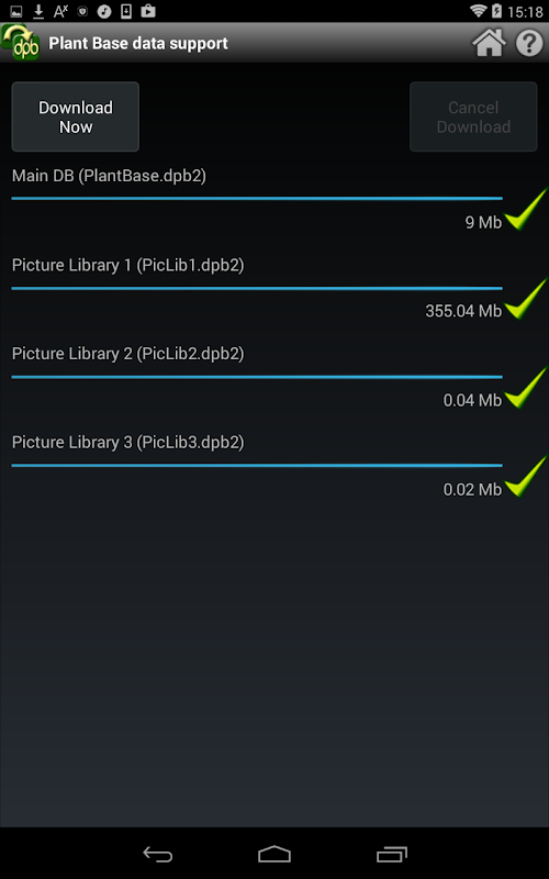 1 - ابتدائی تنصیب یا اپ ڈیٹ کے لئے پلانٹ بیس کے لئے ڈیٹا بیس فائلوں کو ڈاؤن لوڈ کریں۔ مین ایپ کو انسٹال کرنے سے پہلے یا بعد میں چلایا جاسکتا ہے۔ فائلیں بڑی ہیں اور اچھے انٹرنیٹ کنکشن کی ضرورت ہے۔ وہ پلانٹ بیس ڈائرکٹری میں محفوظ ہیں ، جو ضرورت پڑنے پر تیار کی جائیں گی۔