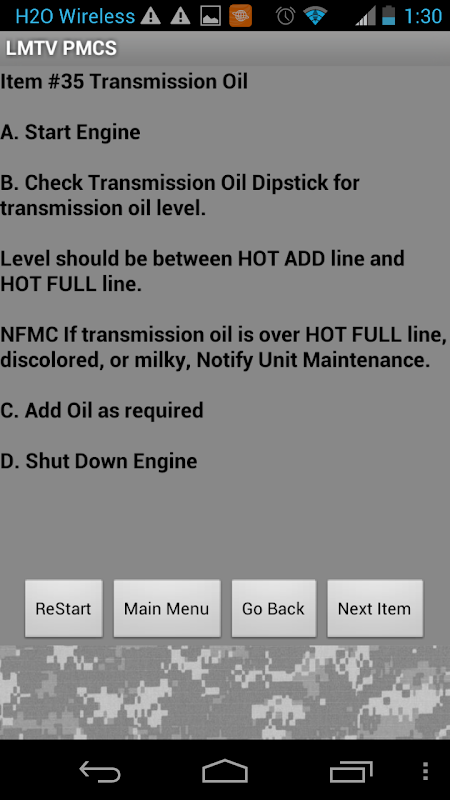 Offline, PMCS App for Military vehicles for U.S. Army, U.S. Marines, Airforce, Army National Guard and Army Reserve. Never be without a -10 TM manual again and have to listen to the 1SG asking you "Where is your TM at??". Just reply that you are now in the Technological Age and have it right on your Smart Phone. There is no way he can argue that. Have the PMCS Item checklist with you anywhere you go. I personally have never been in a unit that actually had enough TM's to perform PMCS properly on vehicles. So Don't download the "Glitchie" App with a pretty HMMWV pictures the Army paid thousands to have some civilians build. Especially when they spell it HUMMVE come on now. I am sure they were paid thousands to produce that for the Army. This one has the most common military vehicles like HMMWV, LMTV and Generators.