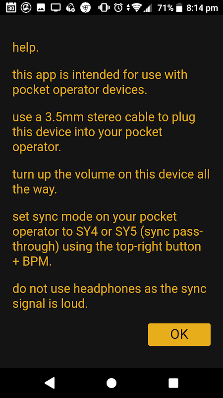This app sends a sync signal that is compatible with the PO in SY4 & SY5 mode. All you have to do is connect your device's output with the PO's input using a 3.5mm stereo audio cable and press play. You can mute, solo, and set the volume for up to four different loops.