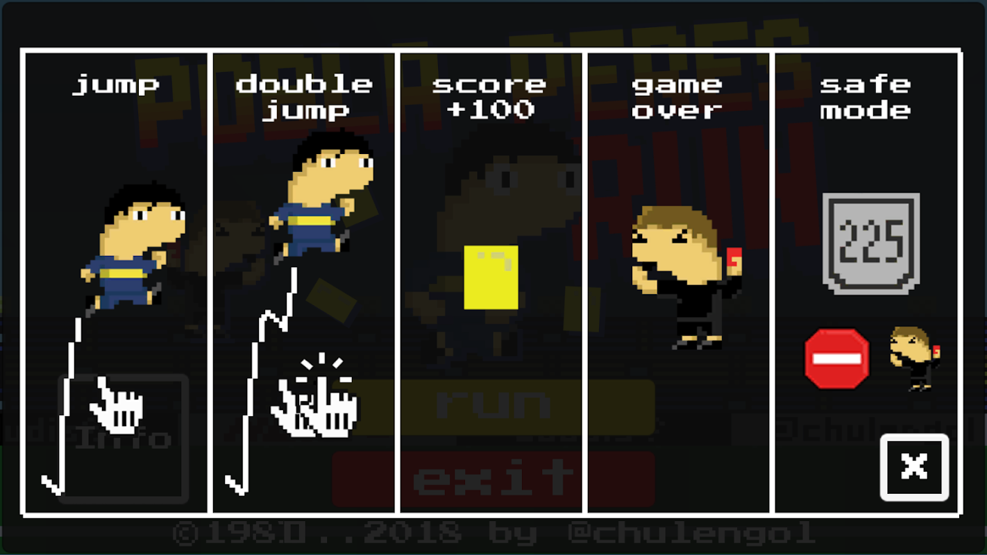 Eres pobla peres y tu objetivo es juntar la mayor cantidad de amonestaciones sin que te expulsen (¡o te detenga algún arquero manco!) corre cada vez más rápido y alcanza nuevas distancias y puntajes, ¡logra todos los objetivos y sé la noticia de los diarios!.