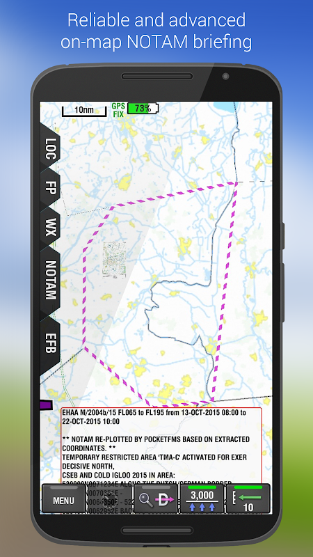 - Integrated Weather: PocketFMS' renowned Weather Information System provides graphical METAR/TAF depiction, W/V at different altitudes, and European Advanced WX forecast (cloudbase, SigWX - rain, fog, thunder);