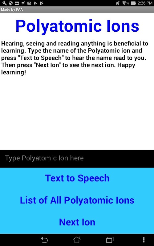 Type the name of the Polyatomic ion and press "Text to Speech" to hear the name read to you. Then press "Next Ion" to see the next ion. To see a list of all the Polyatomic ions on this app press the “List of All” button.