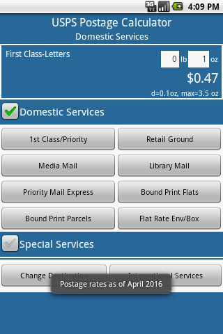 This app allows users to view mailing rates of services offered by USPS. Rates effective April 10, 2016.