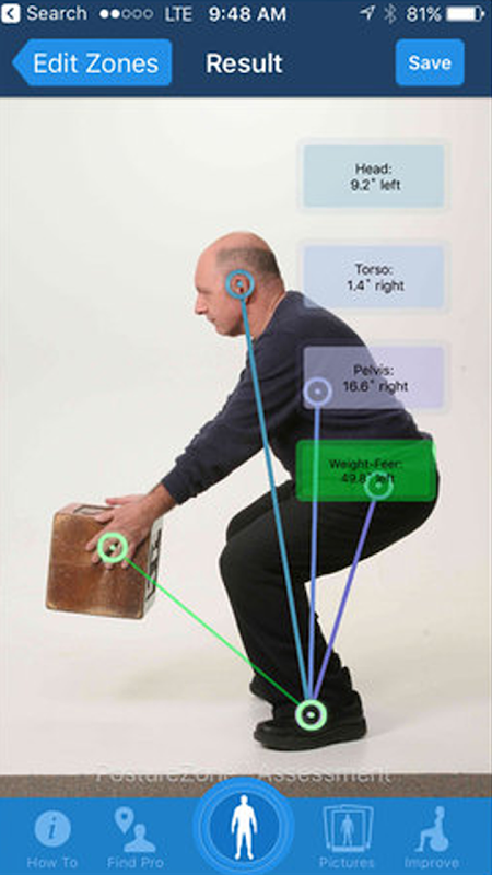-See the alignment & symmetry of your 4 PostureZones- Head, Torso & Pelvis over Feet