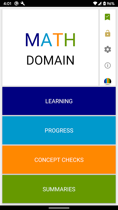پروگریس ایریا پریکٹس ایریا میں ہونے والی پیشرفت پر نظر رکھتا ہے۔ یہ کل سوالات کے جوابات، کل درست، فیصد درست، تفویض کردہ لیٹر گریڈ، تیز ترین اوسط وقت، طویل ترین سلسلہ، اور بہت سے عنوانات کے لیے موجودہ سلسلہ دکھاتا ہے۔ آپ اس علاقے کو براہ راست موضوع کے پریکٹس ایریا میں جانے کے لیے بھی استعمال کر سکتے ہیں۔