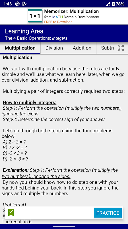پریکٹس ایریا مسئلہ حل کرنے کی درستگی اور رفتار کو بہتر بنانے کی جگہ ہے۔ بے ترتیب طور پر پیدا ہونے والے متعدد انتخاب کے مسائل کی لامحدود تعداد موجود ہے۔ سوال کے جواب کے بعد ہر مسئلے کے لیے مرحلہ وار حل دستیاب ہیں۔ آپ بہت سے عنوانات کے لیے اپنے تیز ترین اوسط اوقات یا درست جوابات کی اپنی طویل ترین لکیریں سیٹ کر سکتے ہیں۔