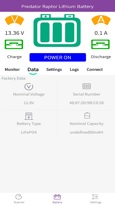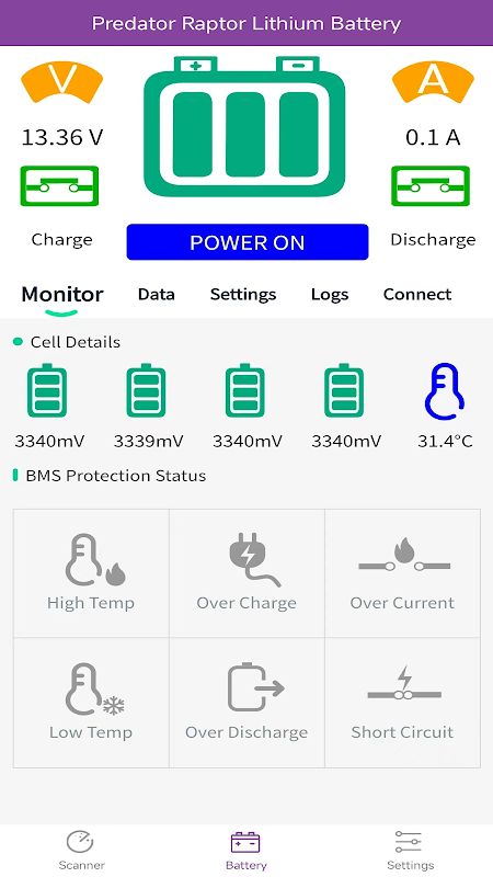 ایک بار منسلک ہونے کے بعد، اسکرین کا اوپری حصہ بیٹری کی موجودہ صورتحال بشمول وولٹیج اور کرنٹ فلو کو ظاہر کرتا ہے، اور آپ کو بیٹری کو آن اور آف کرنے کی اجازت دیتا ہے۔
