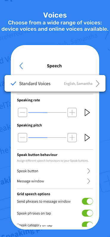 سمارٹ ورڈ پریڈیکشن ٹیکنالوجی کا استعمال کرتے ہوئے، ایپ ٹیکسٹ پر مبنی پیغام کو بولنا آسان بناتی ہے۔ قابل پیشن گوئی آپ کے استعمال کے انداز سے سیکھتا ہے اور پیش گوئی کرتا ہے کہ آپ آگے کیا ٹائپ کریں گے، ٹائپنگ کو آسان اور زیادہ موثر بناتا ہے۔