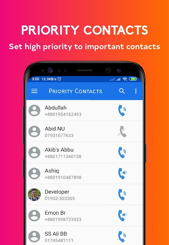 Priority contacts is a contacts manager app that give you opportunity to set contact priority. You can do contact management by providing your contact priority. There are three Priority level. You can set your important contact or favorite contact to high priority because they can be always ringer mode even in silent, high priority calls will ring. Medium priority contact always play vibration, even they are in sound mode or silent mode. Disturbed contact or Sim company number you can keep in Low priority. Those disturbing calls won't be block but it will ignoring by mute call and silent.