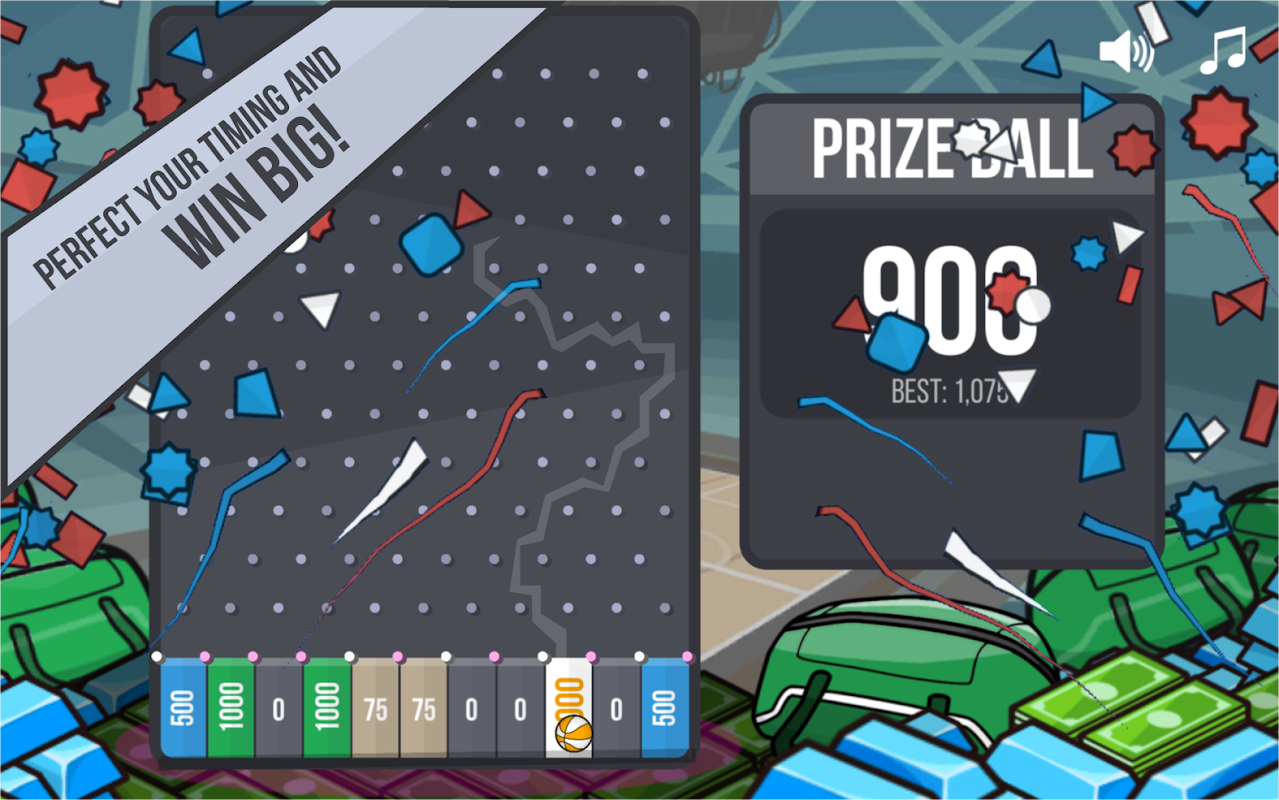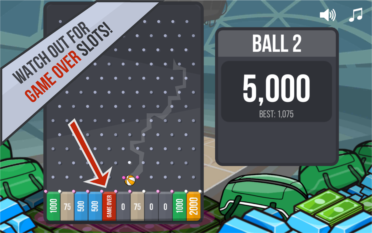 Drop the basketball through the pegs into the top prize slots! But watch out, the pegs are very bouncy!