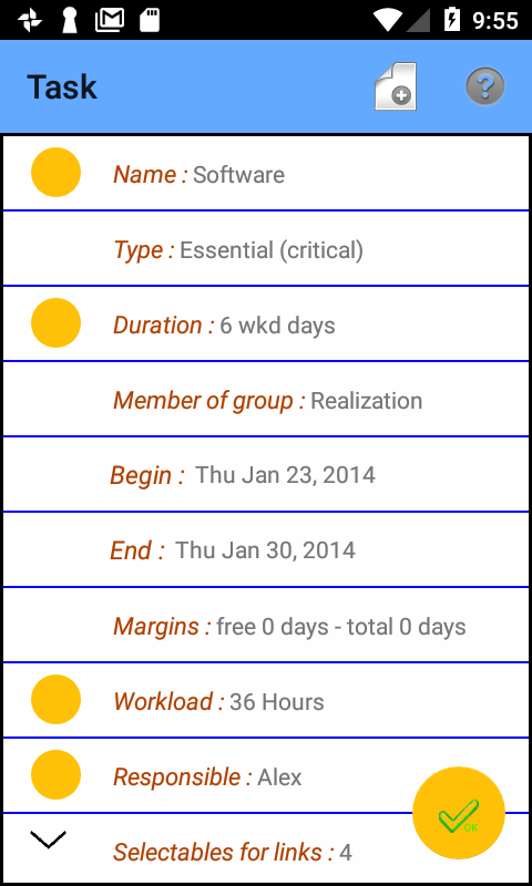 - کاموں کی مدت اور تاخیر کام کے دنوں کی پوری تعداد میں ہے،