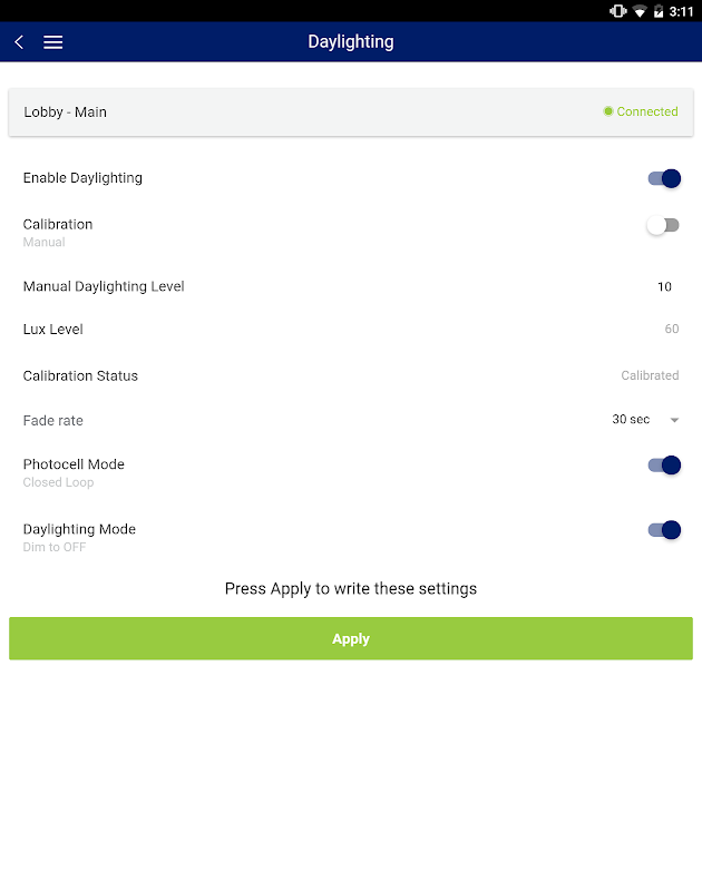 Configure daylight harvesting levels, occupant sensor range and sensitivity, vacancy timeouts, partial on/off levels, and demand response action all with your Bluetooth mobile device.