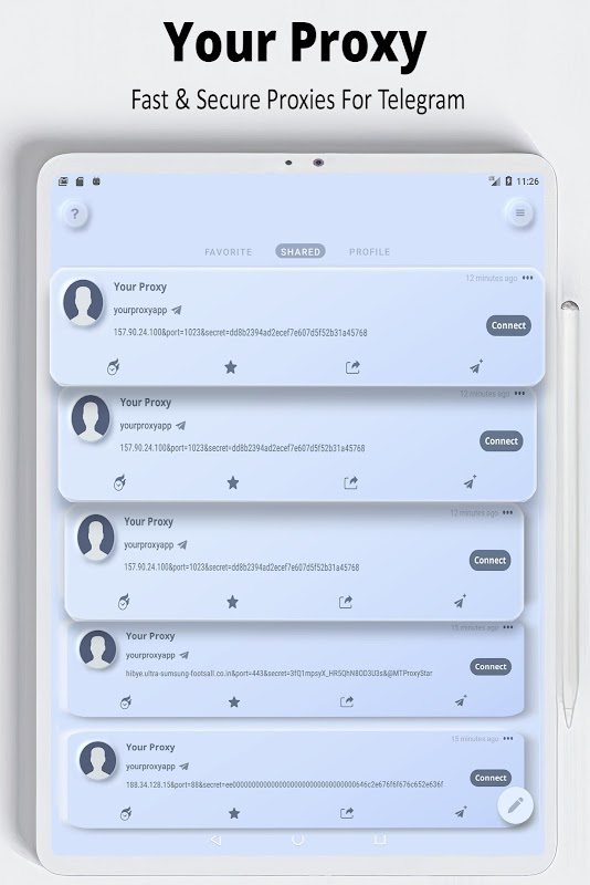 آپ کی پراکسی ایک سادہ اور طاقتور ایپ ہے جس کی مدد سے آپ کو قابل اعتماد MTProto پراکسیوں کے ساتھ ٹیلیگرام سے ایک محفوظ اور تیز رفتار رابطہ حاصل ہوتا ہے۔