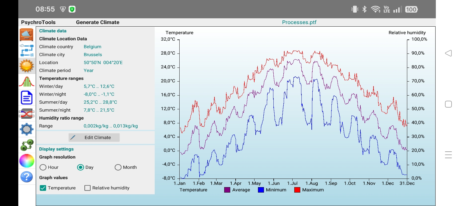 ایپ آپ کو تفصیلات کی مختلف سطحوں پر جدولوں میں نتائج دکھاتی ہے، بلکہ ایک متحرک سائیکرومیٹرک یا مولیر ڈایاگرام پر بھی دکھاتی ہے: اس نقطہ کی ہوا کی حالت کے بارے میں تمام معلومات حاصل کرنے کے لیے خاکے میں کسی بھی پروسیس پوائنٹ پر کلک کریں۔ ایک مخصوص مدت (گھنٹہ، دن، مہینہ، سال) دیکھیں اور فوری طور پر اس مدت کے اندر ہیٹنگ اور کولنگ کی مطلوبہ صلاحیتیں حاصل کریں، بلکہ وہ گھنٹہ بھی جس کے دوران گنجائش کی زیادہ سے زیادہ ضرورت تھی۔