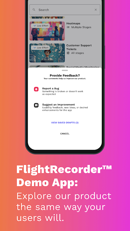 Pulse UX طریقوں کا مقصد ہر اس شخص کے لیے ہے جو صارف کے تاثرات کے ذریعے اپنی ایپ کو بہتر بنانے میں دلچسپی رکھتا ہے۔ Pulse FlightRecorder SDK کی نمائش کر کے، یہ ایپ کی فعالیت اور صارف کے تجربے کو بہتر بنانے کے لیے فیڈ بیک کیپچر کرنے اور استعمال کرنے کے لیے ایک ہموار انداز کی وضاحت کرتا ہے۔