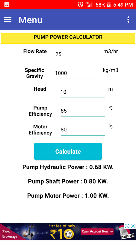 یہ ایپ پمپ ہائیڈرولک پاور ، پمپ شافٹ پاور اور پمپ موٹر پاور کا حساب لگاتی ہے