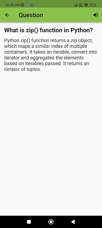 "Python Interview Questions" ایک خصوصیت سے بھرپور موبائل ایپلی کیشن ہے جو طلباء، ملازمت کے متلاشیوں، اور پیشہ ور افراد کو C پر فوکس کرتے ہوئے انٹرویوز کی تیاری میں مدد فراہم کرنے کے لیے بنائی گئی ہے۔ 150 سے زیادہ سوالات کے وسیع مجموعے کے ساتھ، یہ ایپ Python سے متعلق ایک وسیع اسپیکٹرم کا احاطہ کرتی ہے۔ ایسے عنوانات جو صارفین کو ان کے علم کو بڑھانے اور انٹرویو کے دوران ان کے اعتماد کو بڑھانے میں مدد فراہم کرتے ہیں۔