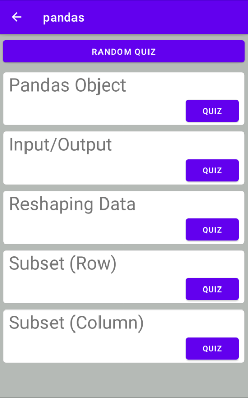 فی الحال ، اس ایپ میں نمپی ، پانڈاس لائبریری کے بارے میں کوئزز ہیں۔