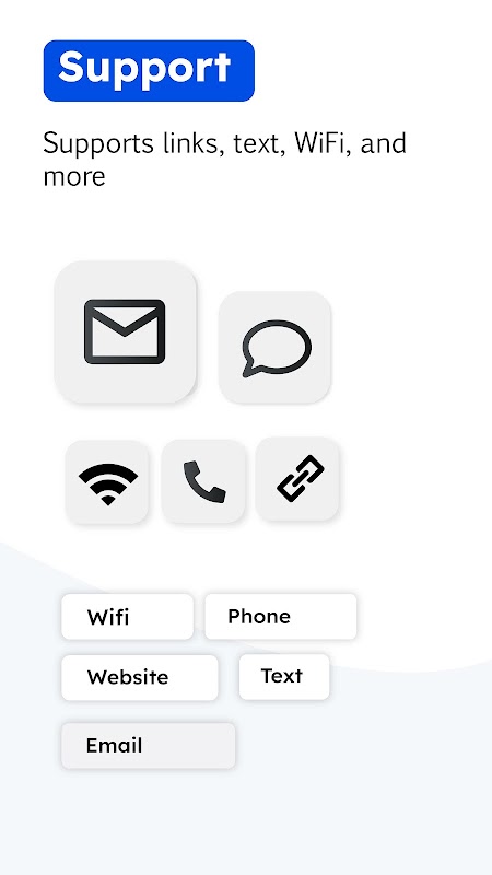 - یو آر ایل، وائی فائی، رابطے کی معلومات، فون نمبر، ٹیکسٹ، کیلنڈر ایونٹس، ای میل، پیغامات، اور نقشے کے مقامات کے لیے کیو آر کوڈز پڑھیں
