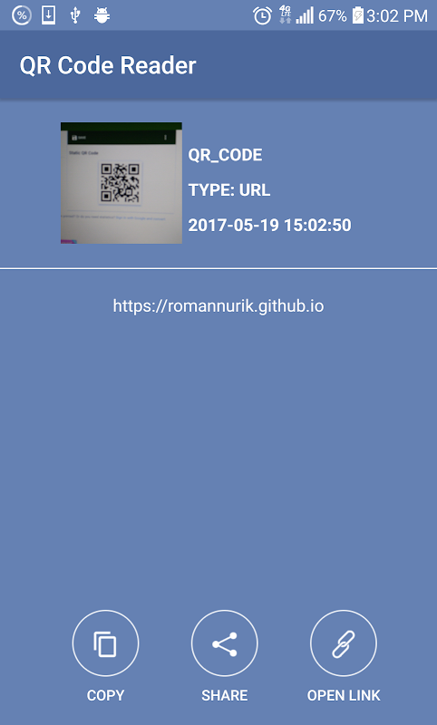 To scan the QR Code, simply open the application, align the code. QR Code Reader will automatically recognize any QR Code. When scanning the QR Code, if the code contains a URL, you can open browser to the site by press browser button . If the code contains only text, you can instantly see.
