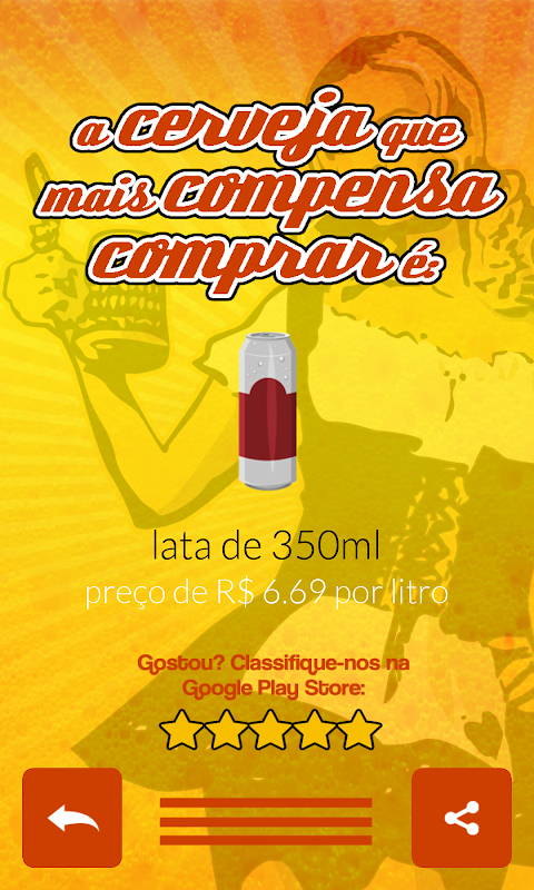 Sempre que você vai fazer compras com os amigos, para fazer aquele churrasco, surge a dúvida: Qual cerveja compensa levar? Será que é melhor levar a latinha, ou a long neck? Ou será que é melhor a garrafa? Não, acho que é o barril ein? Acabe com as suas dúvidas de uma vez por todas! Este aplicativo permite que você veja qual é a embalagem de cerveja que compensa mais levar. Tudo que você precisa fazer é digitar o valor de cada embalagem. Caso não tenha a embalagem no aplicativo ainda, você pode inserir, informar quantos ml, e pronto!