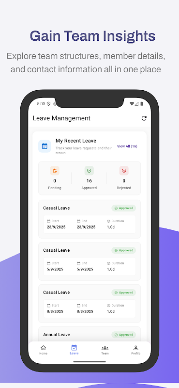 ⏱️ ریئل ٹائم لیو بیلنس دیکھیں: اپنی چھٹی کی تاریخ، منظوریوں اور زیر التواء درخواستوں کے ساتھ تازہ ترین رہیں۔