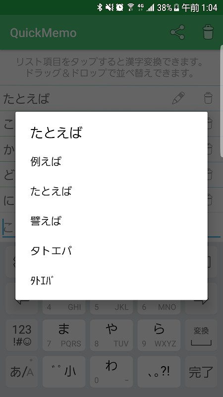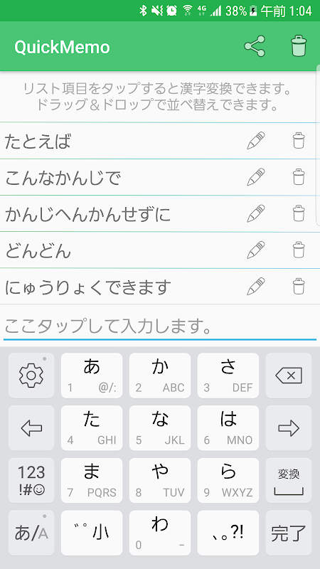 QuickMemoは速記用のメモ帳アプリです。 ひらがなで入力しておき、後で漢字変換できます。