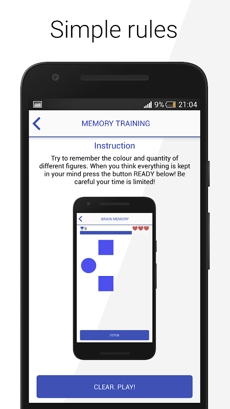 Our game improves your memory and trains your brain. Brain is rather complicated mechanism which is hard to train. But our app will try to do all possible in order to make your memory, attention, thinking and visual memory be on the high level.