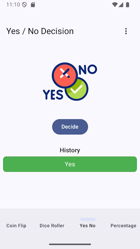 ایک سکے کو پلٹائیں، ڈائس رول کریں، ہاں/نہیں یا فیصد منتخب کریں۔ تفریحی فیصلہ ساز ایپ!