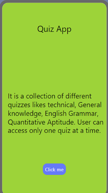 "کوئز ایپلی کیشن" مختلف قسم کے کوئزز کا مجموعہ ہے جیسے تکنیکی، کھیل، کھیل وغیرہ۔ ایک صارف تمام کوئز تک رسائی/کھیل سکتا ہے اور کسی ایک کو آزما سکتا ہے۔ محدود تعداد میں سوالات ہوں گے اور اگر آپ صحیح جواب کا اندازہ لگاتے ہیں تو آپ کوئز ختم ہونے تک اگلے کوئز میں جائیں گے اور اگر کسی کھلاڑی نے سوال کا غلط جواب دیا تو وہ اسے شروع سے دوبارہ دہرائیں گے کیونکہ اب کوئی پابندی نہیں ہے۔