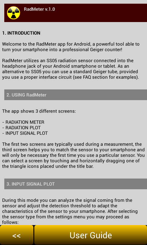 یہ ایپ ایک حقیقی کام کرنے والا ریڈی ایشن میٹر ہے بشرطیکہ آپ ایک بیرونی سینسر SS05 کو جوڑیں۔ اگر آپ کوئی سینسر نہیں لگاتے ہیں تو ایپ فون کے اندرونی مائیک کو صرف نمائشی مقاصد کے لیے استعمال کرے گی۔ SS05 کے بارے میں مزید تفصیلات http://optivelox.50webs.com/DL_en/ss0x.htm پر دستیاب ہیں۔
