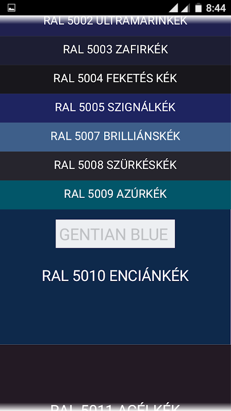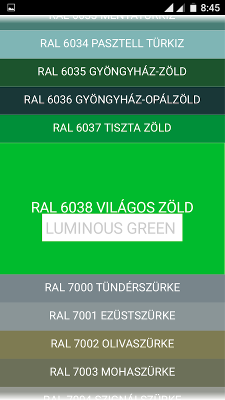 Az alkalmazás a Classic RAL rendszer szerinti szabványos színek áttekintését jeleníti meg kódokkal. Magyarul írva, a kódok színeivel, mindez angolul írásban és kimondva.