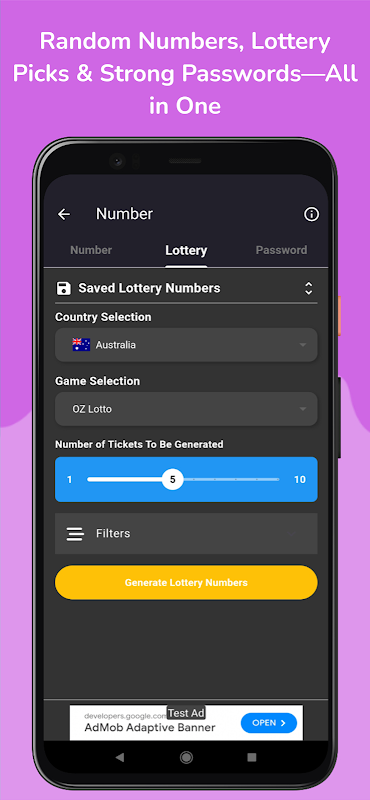 • لاٹری پک اور رینڈم نمبر جنریٹر: میگا ملینز، پاور بال، کیش 4 لائف، پک 3، پک 4، لوٹو اور بہت سے دوسرے جیسے امریکی گیمز کے لیے فوری چنیں۔ یا محفوظ پاس ورڈز بنائیں، جو آپ کے آلے پر محفوظ طریقے سے محفوظ ہیں۔
