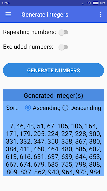 You can also decide if you want to exclude specific numbers or not, if you want random numbers to be repeated or not and sort the results by either ascending or descending order (the default order is randomly).