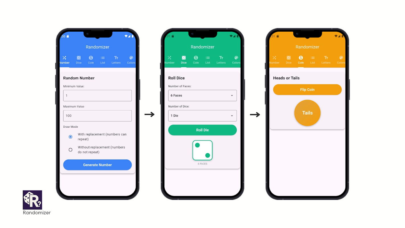 ایک بدیہی، ہلکے اور رنگین انٹرفیس کے ساتھ، Randomizer کو سادہ، تیز اور ورسٹائل بنانے کے لیے ڈیزائن کیا گیا تھا۔