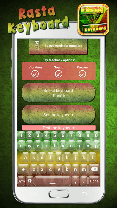 Download Rasta Keyboard and you will get six amazing “keyboard skins” - “gold rasta keyboard”, “weed keyboard”, “reggae keyboard”, “marijuana keyboard” and much more! This is one of the best “rastafarian apps” and “marijuana apps” that can be found! Change your “keyboard designs and fonts” with some of these “keyboard themes free” and “rasta wallpapers” and you will be the coolest person among your friends! This will be your new favorite app especially if you like “reggae music”! Install Rasta Keyboard with only one click and you will get the “best reggae” app with “keyboard themes free”! You will be amazed with this “imagery keyboard” collection and each “rasta background” and “weed theme” will make your keypad more attractive!